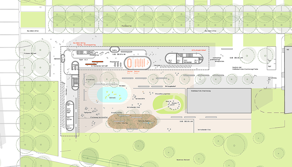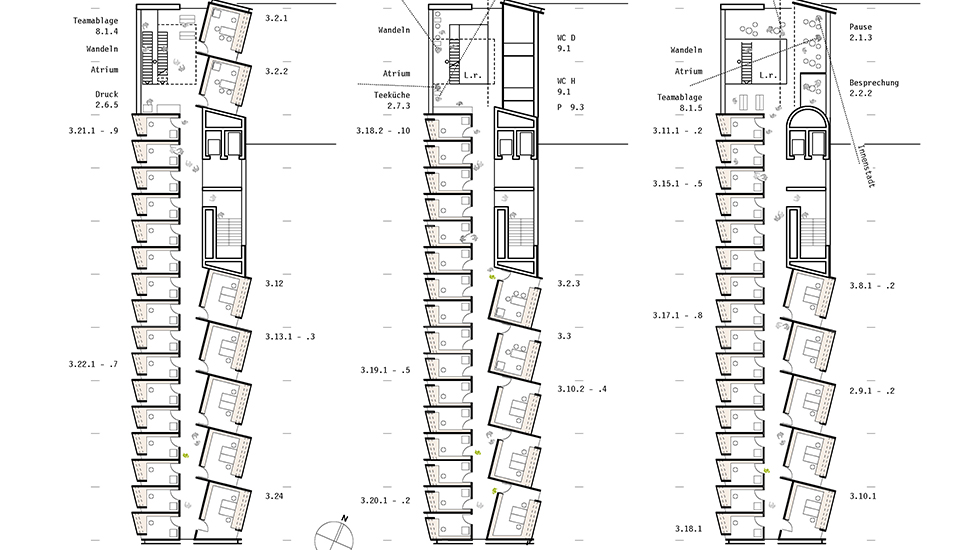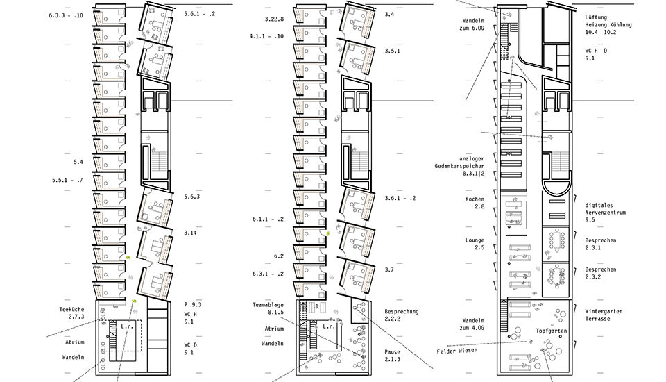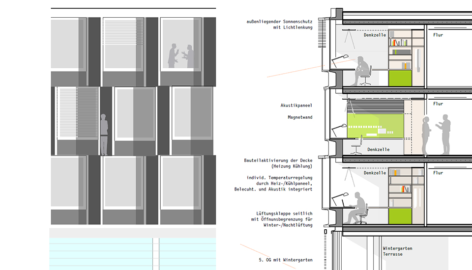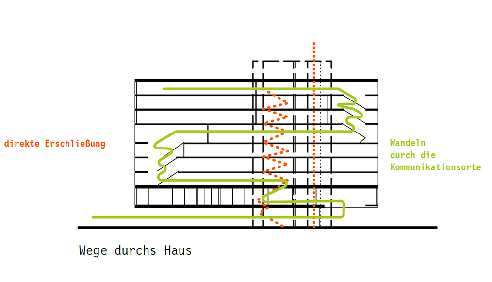 Der durch alle Obergeschoss führende "Philosophenweg" verbindet als durchgängige institutsinterne Promenade die Denkzimmer mit den Kommunikations- und Treffpunkten in dreigeschossigen Gemeinschaftsräumen, der Bibliothek, der Lounge und den Besprechungsräumen im mittleren Gemeinschaftsgeschoss.
