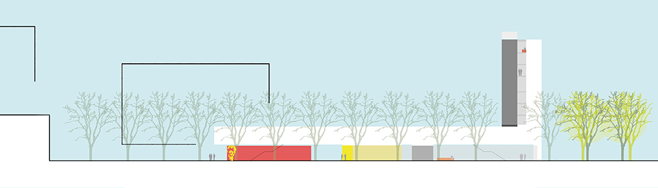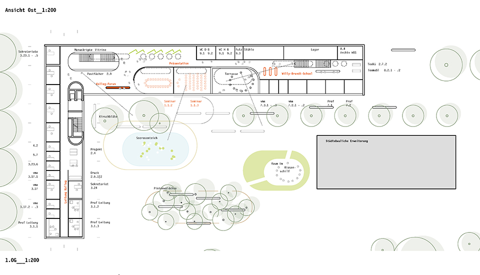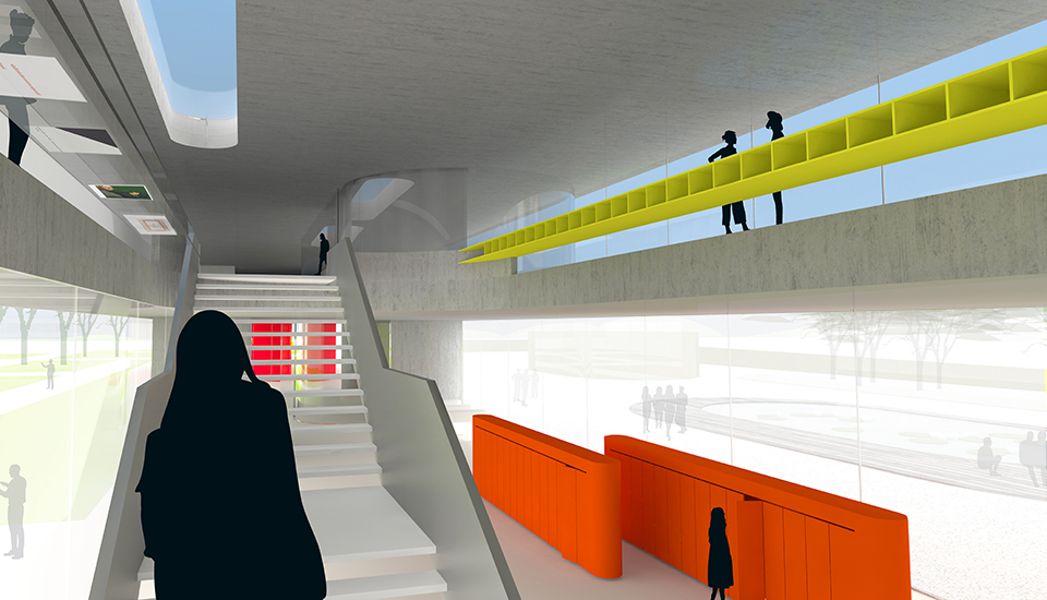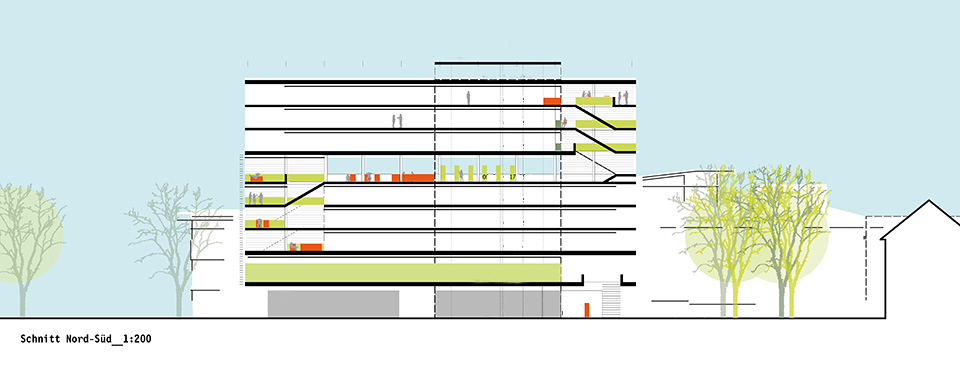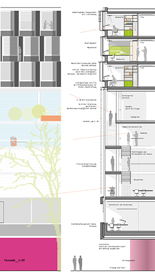 Die zwei unteren Geschosse und der "Philosophenhof" sind öffentlich zugänglich mit Lehrsälen, Ausstellungsfläche und informellen Aufenthaltsangeboten.